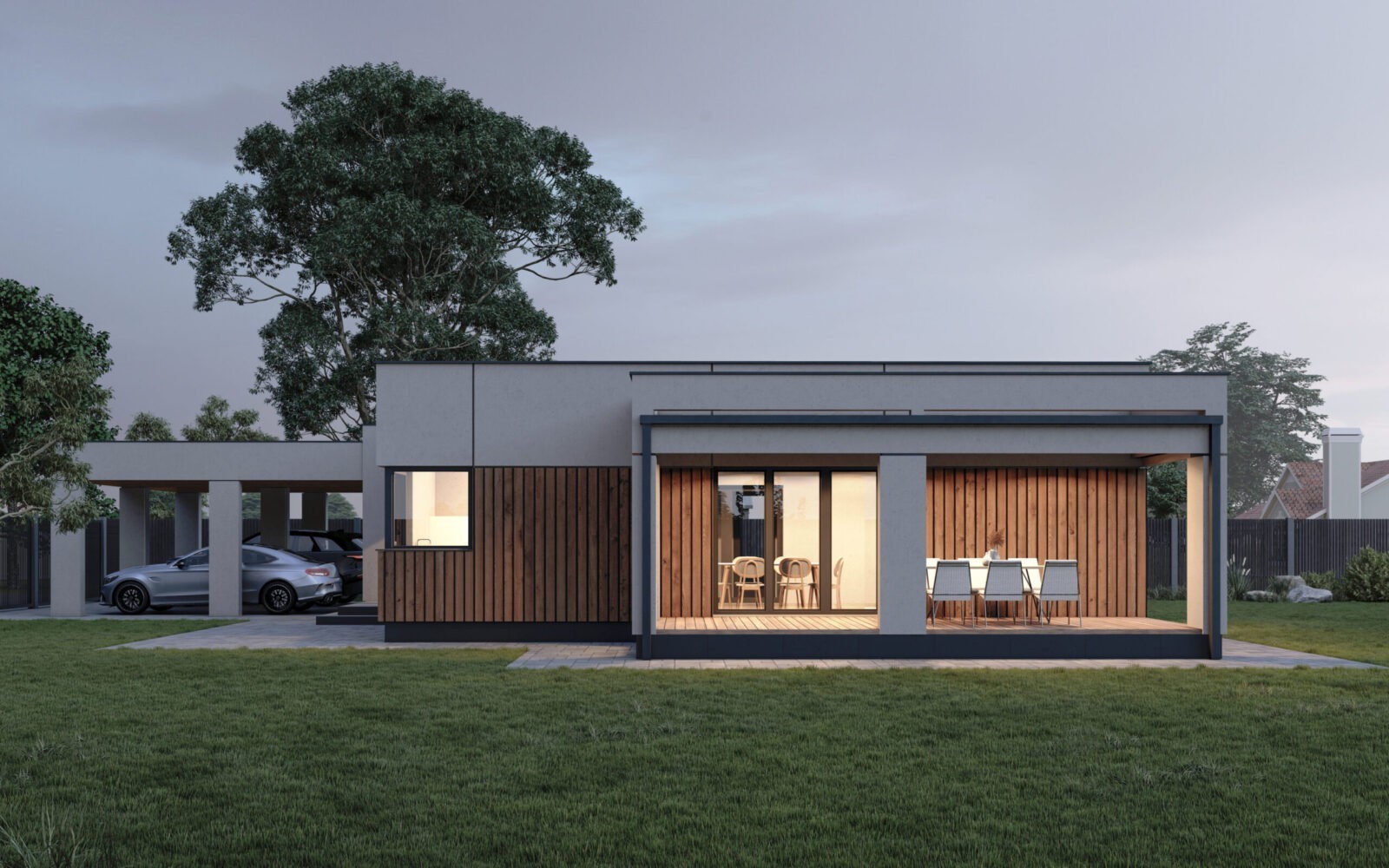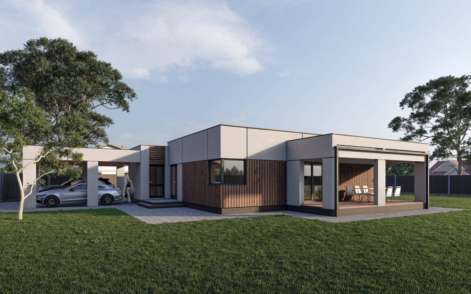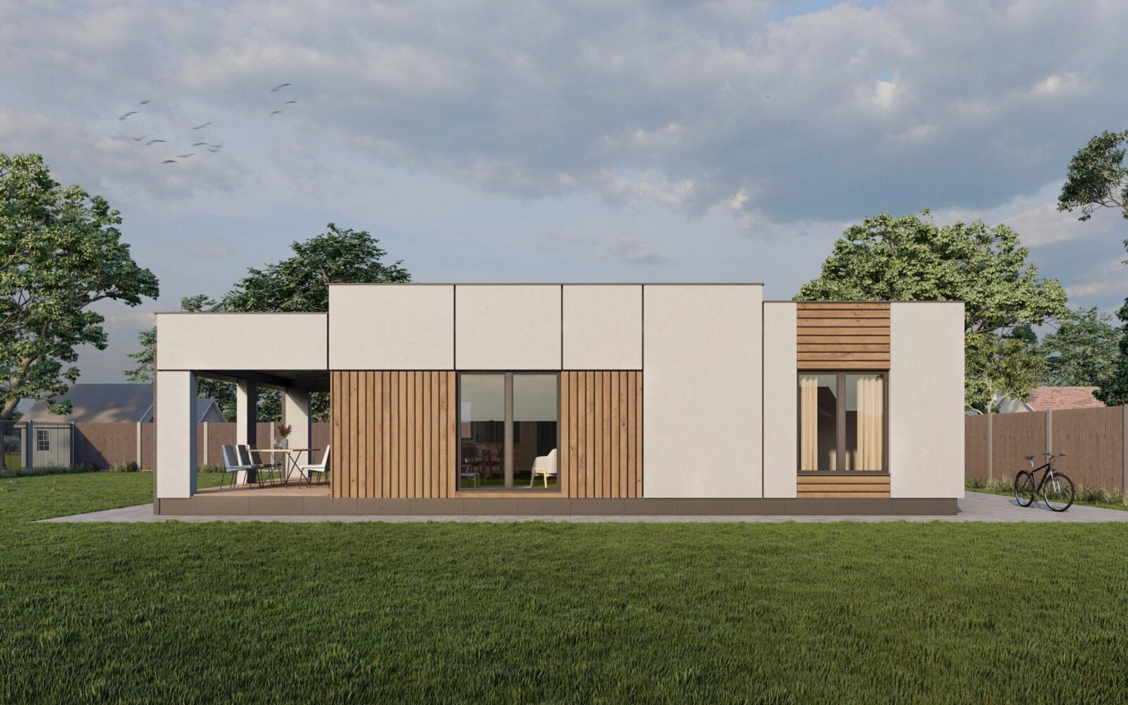 107 m² single-storey SIP home designed for comfortable, efficient living in Spain. Bright 44.5 m² day area, wide covered terrace, and a layout that works for permanent living or a stylish second home. Delivered factory-direct with Viveo × Structur.