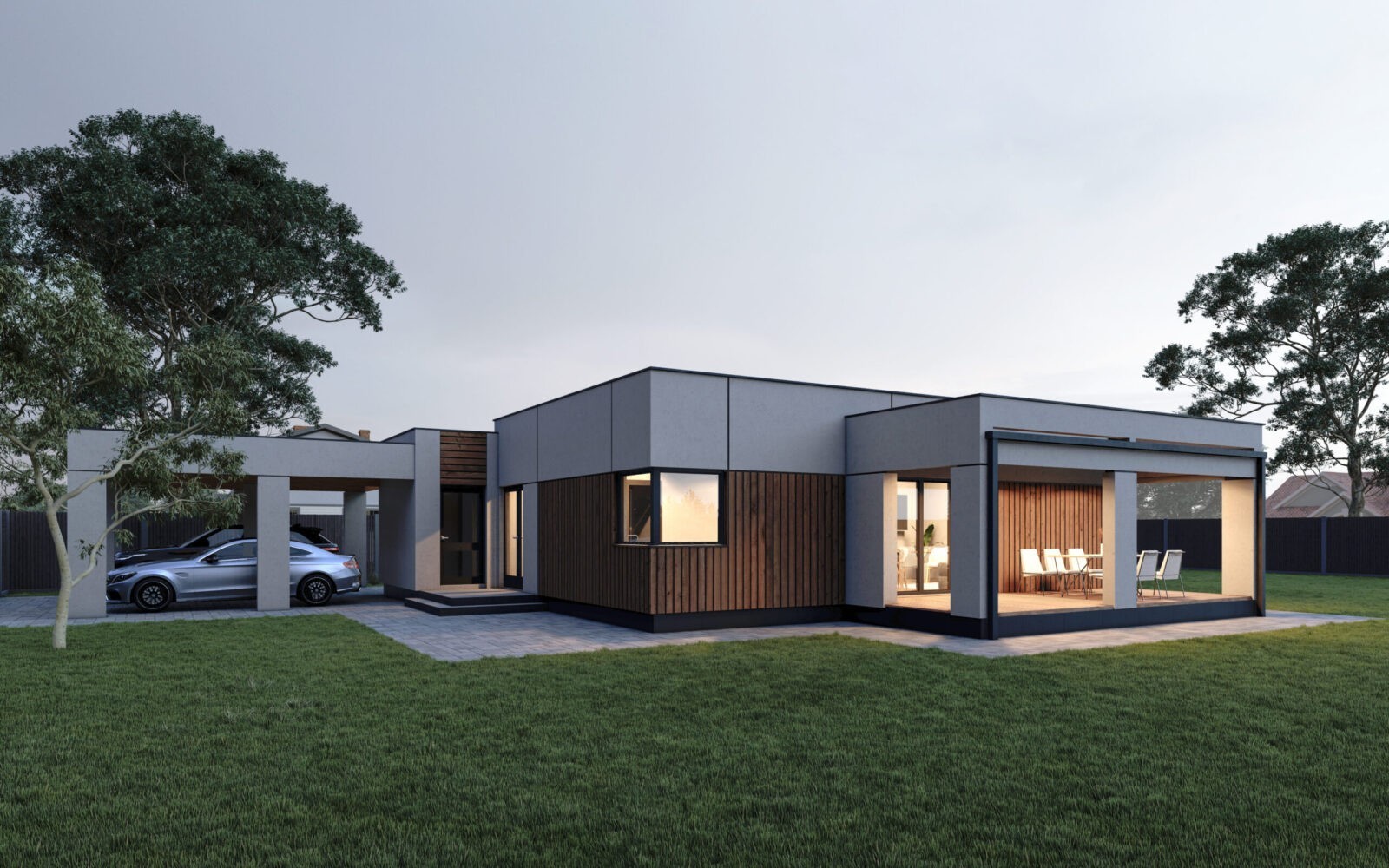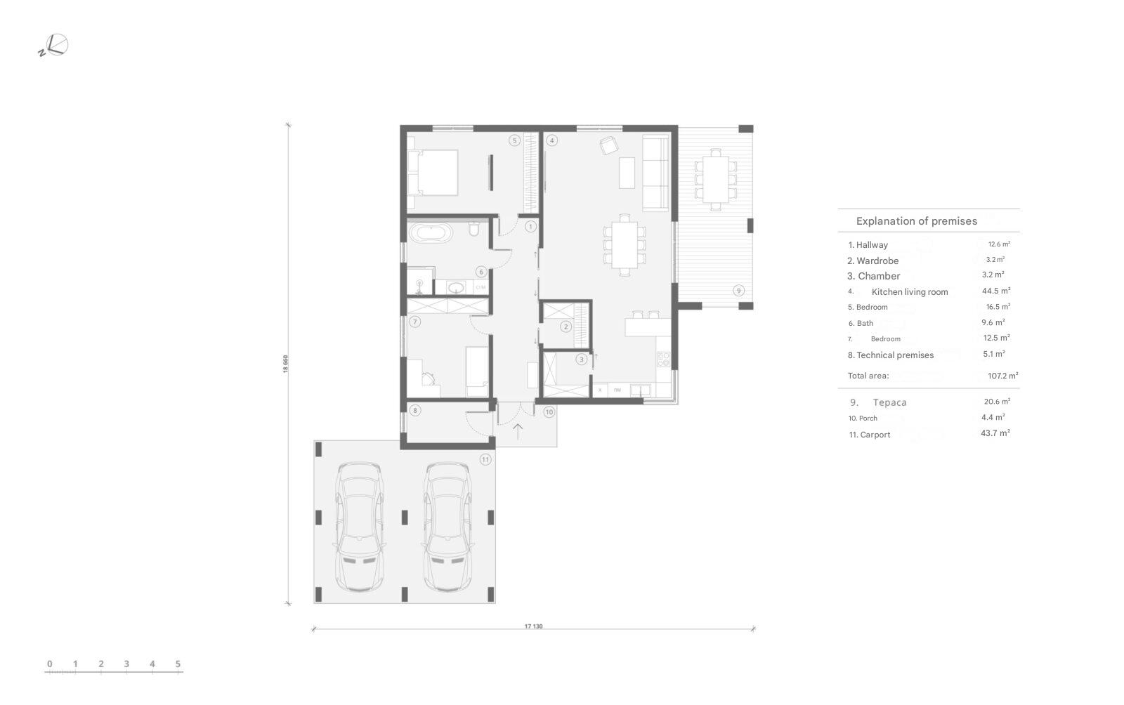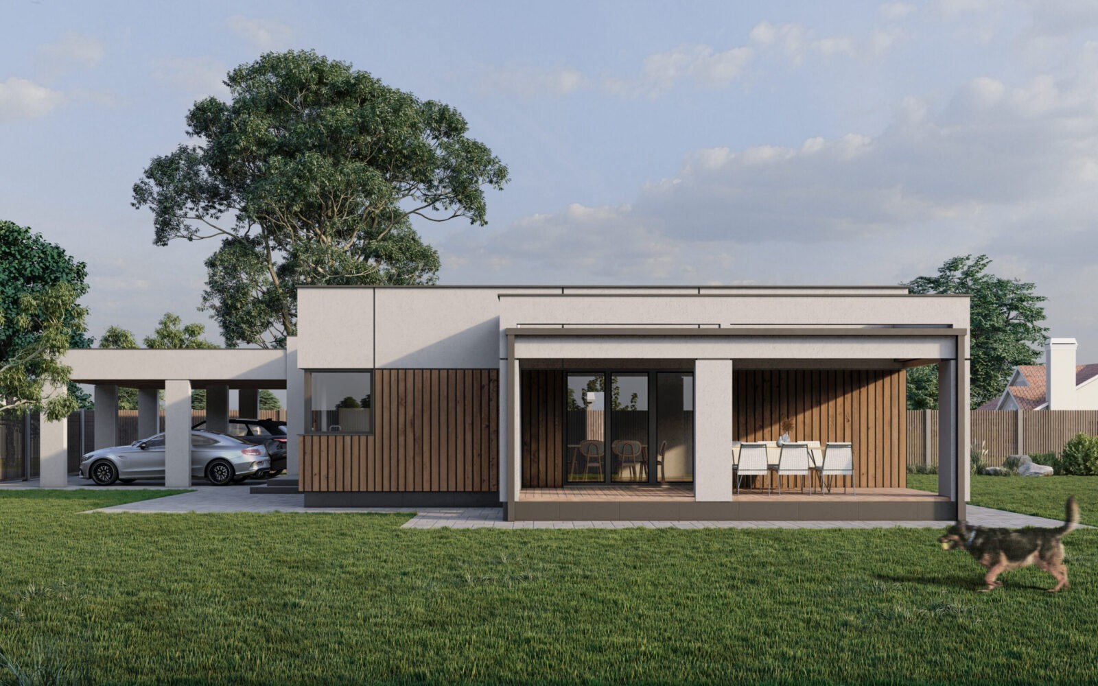 107 m² single-storey SIP home designed for comfortable, efficient living in Spain. Bright 44.5 m² day area, wide covered terrace, and a layout that works for permanent living or a stylish second home. Delivered factory-direct with Viveo × Structur.