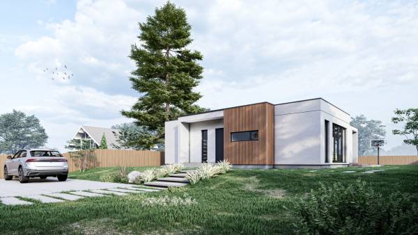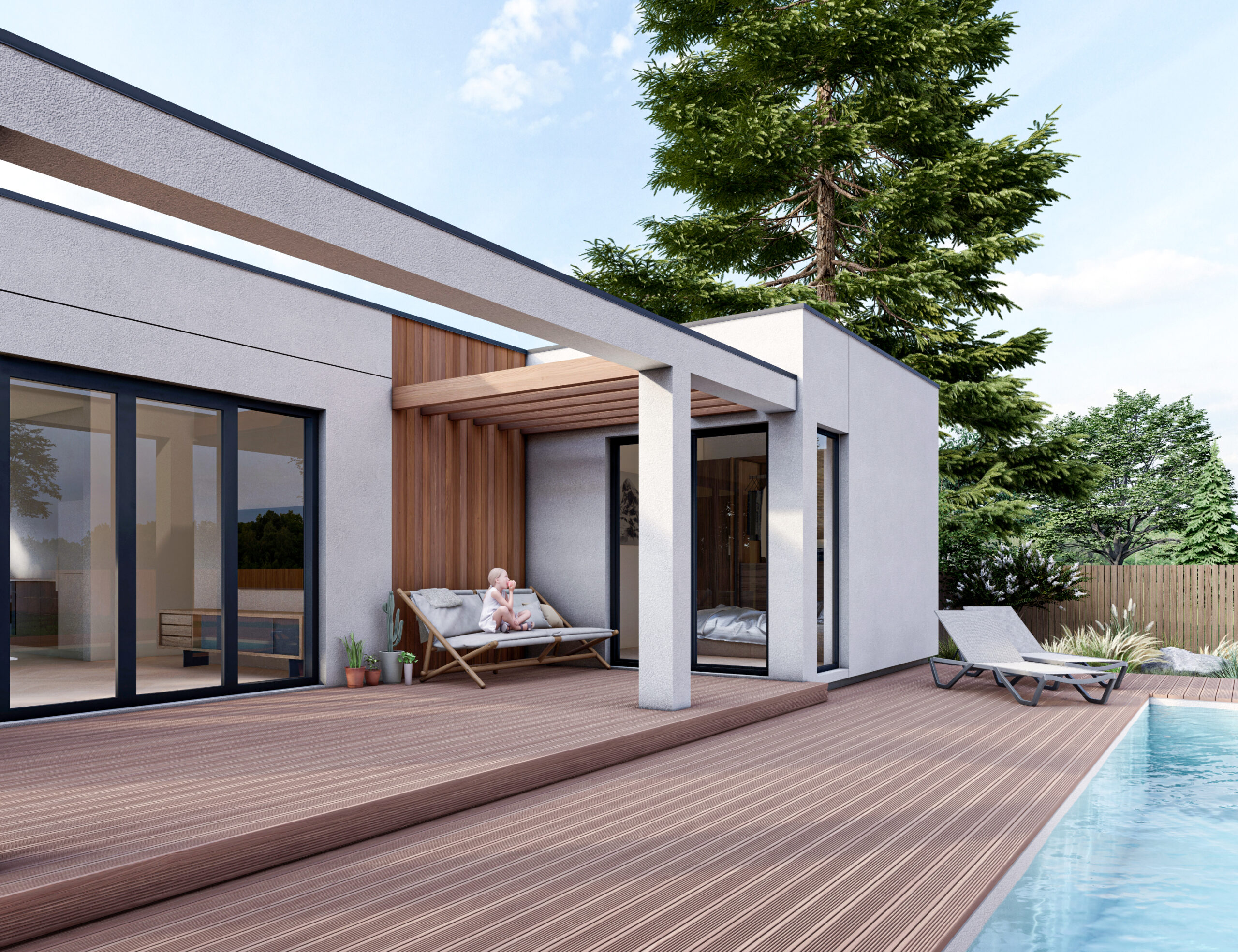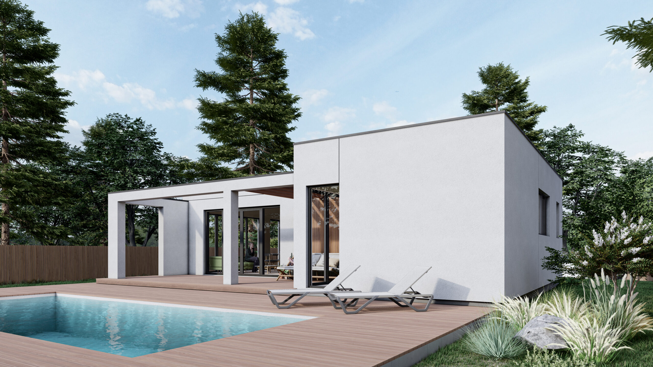 112.7 m² single-storey SIP home for modern family living IN SPAIN. Bright open plan, energy-efficient envelope, and optional large terrace. Delivered factory-direct with Viveo × Structur.